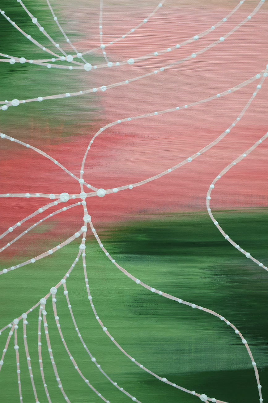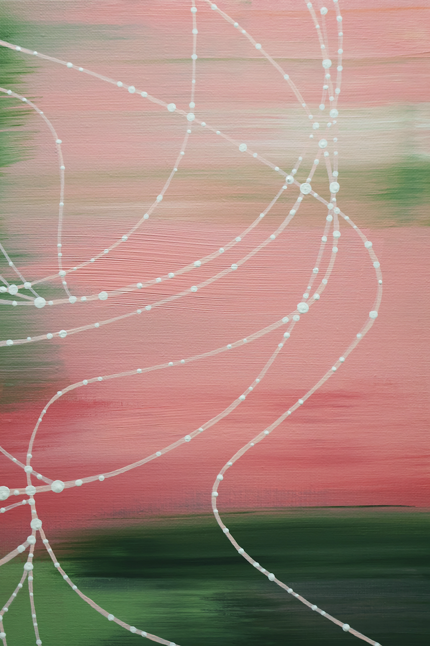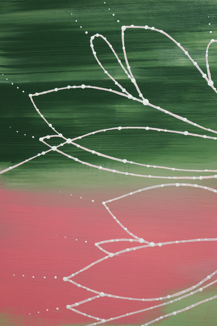 Amid deep green tones symbolizing leaves that have overcome winter’s chill, soft pink hues spread gently—evoking spring blossoms as they begin to bloom.