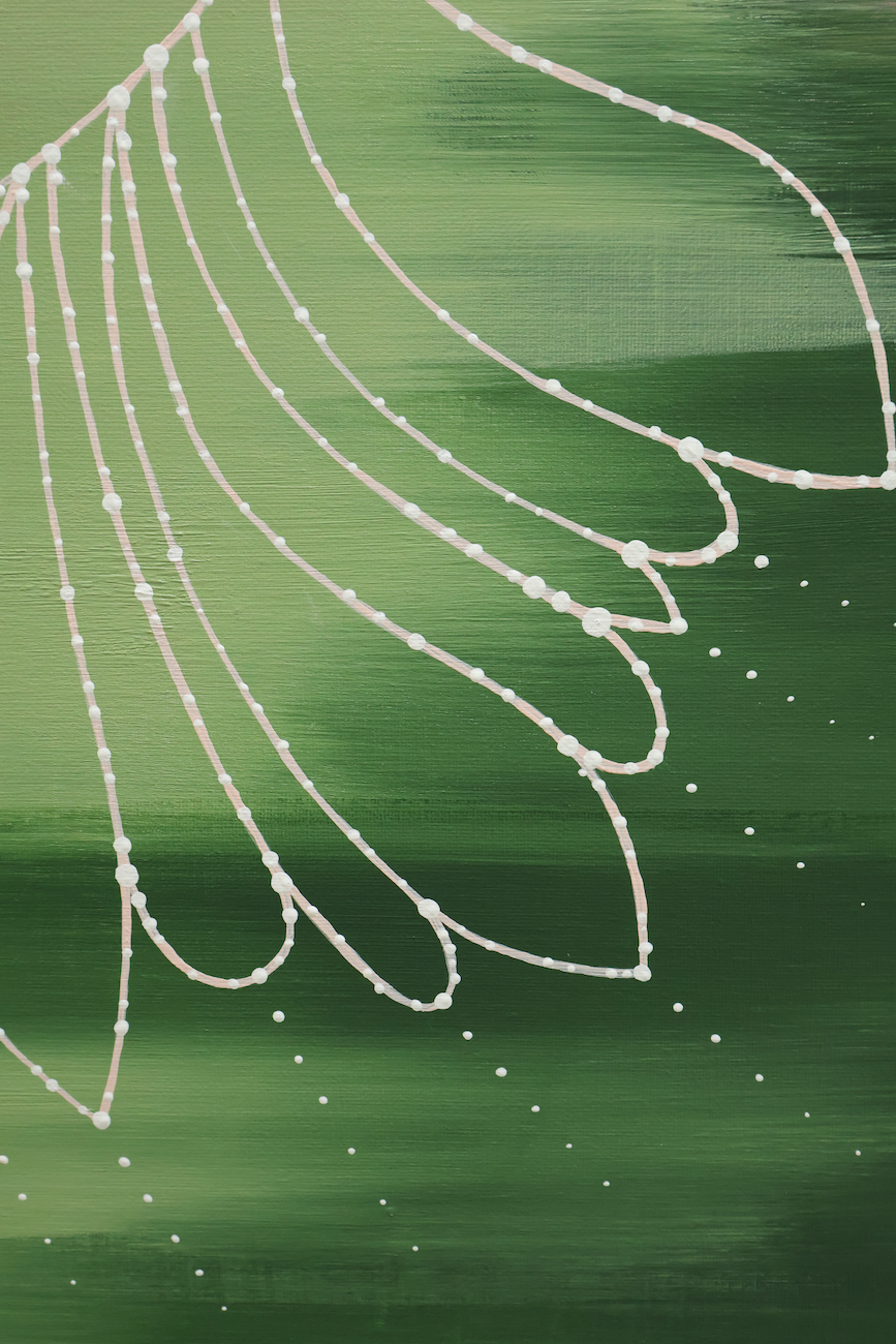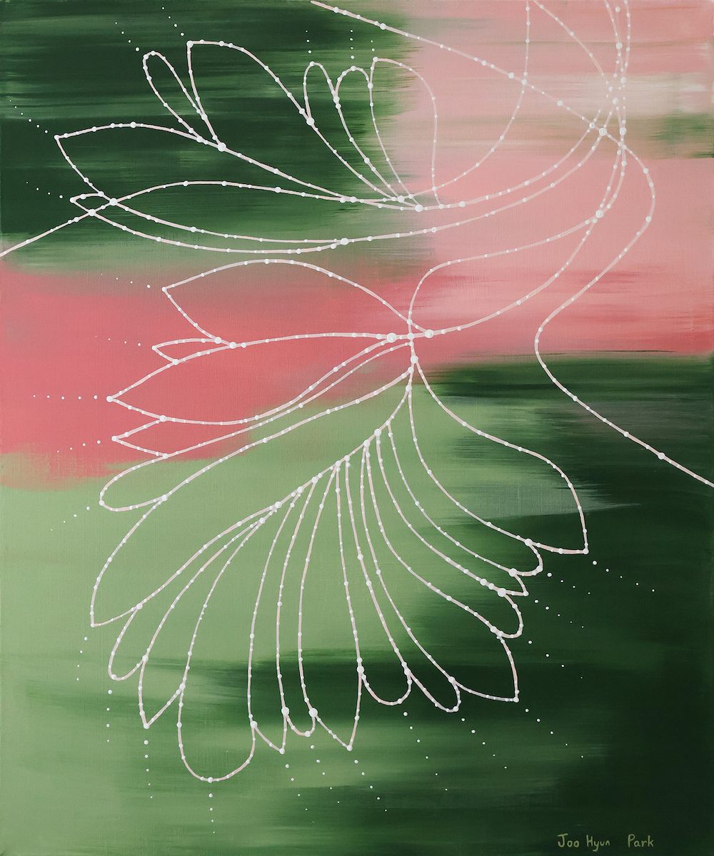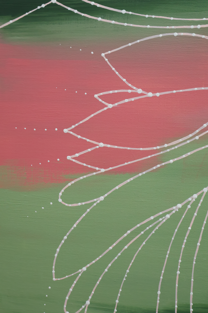 Amid deep green tones symbolizing leaves that have overcome winter’s chill, soft pink hues spread gently—evoking spring blossoms as they begin to bloom.