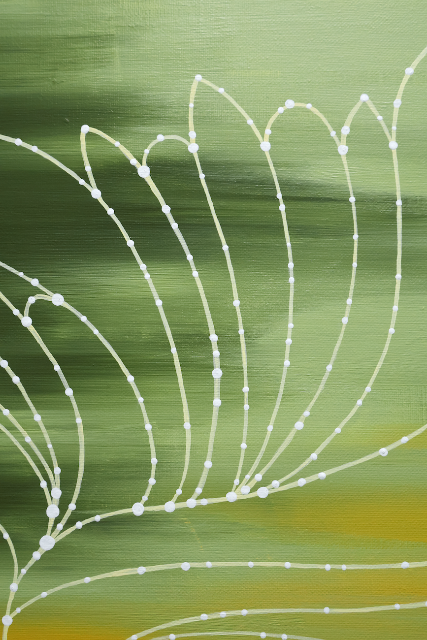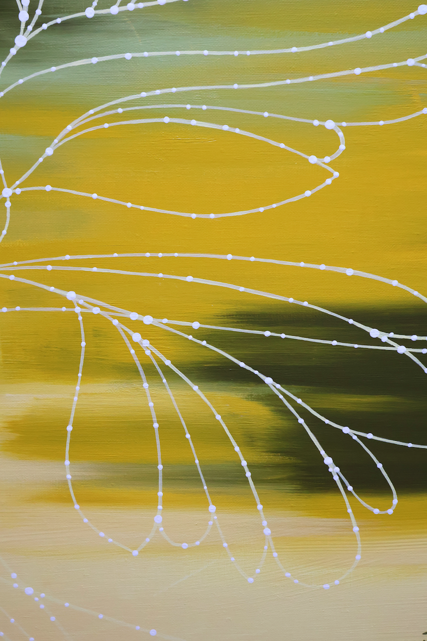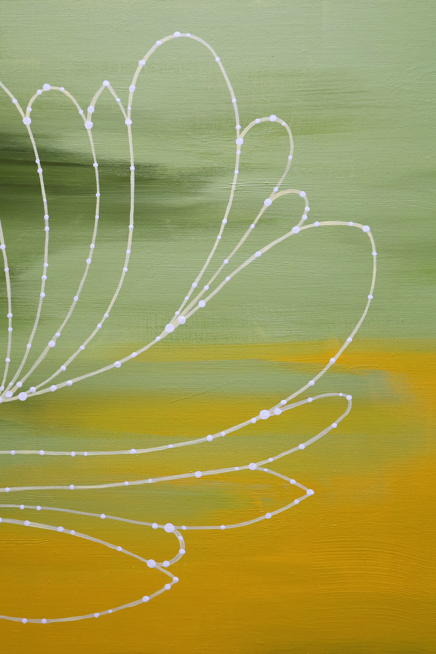 Faded green tones represent weary leaves that have endured the heat of summer, while soft yellow hues, like fallen autumn leaves, spread gently around them.