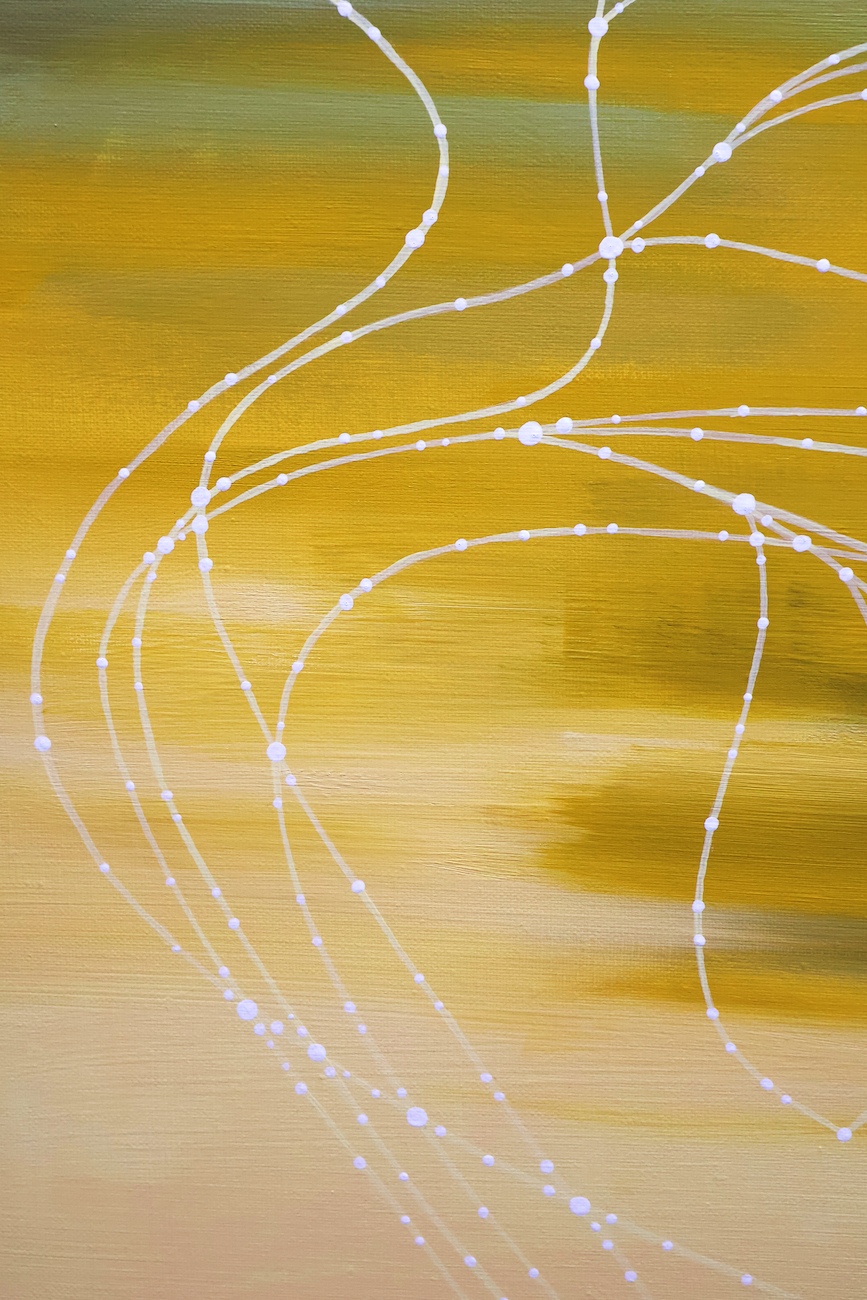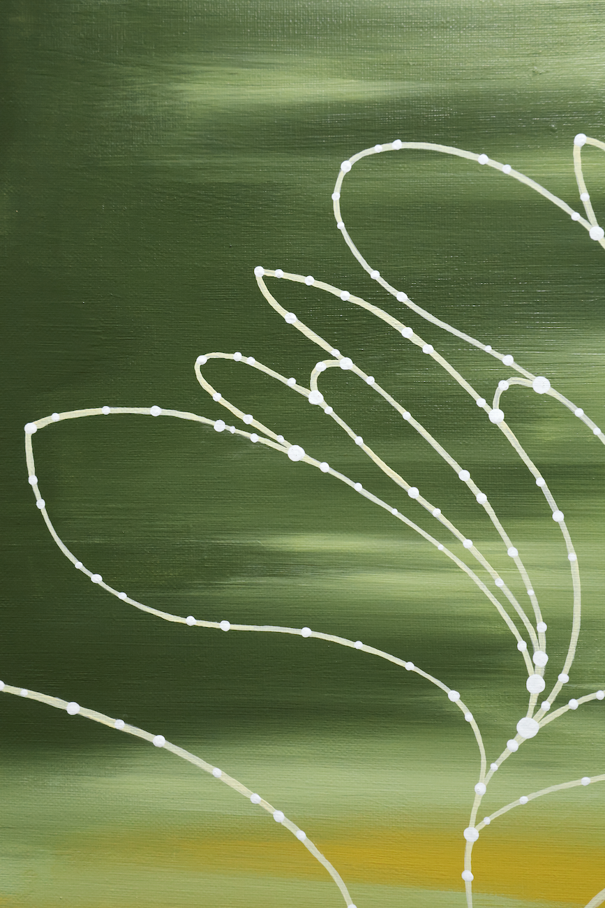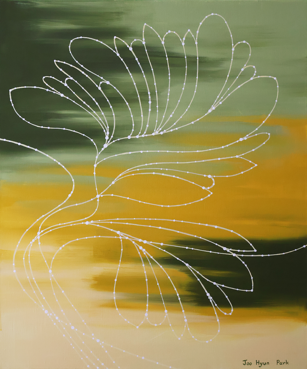 Faded green tones represent weary leaves that have endured the heat of summer, while soft yellow hues, like fallen autumn leaves, spread gently around them.