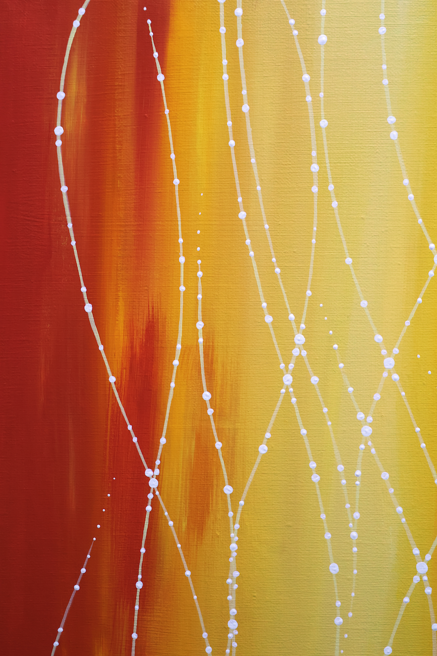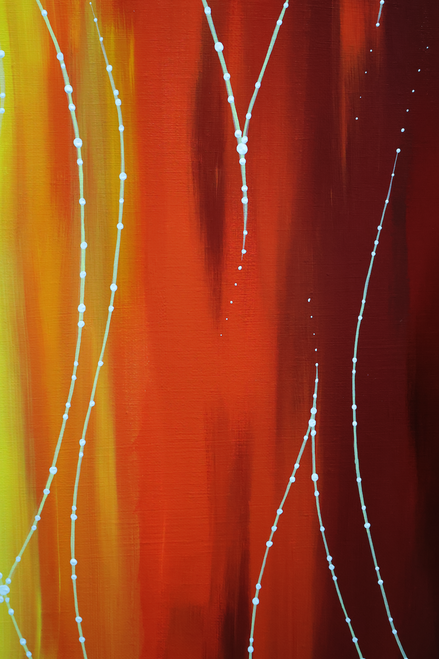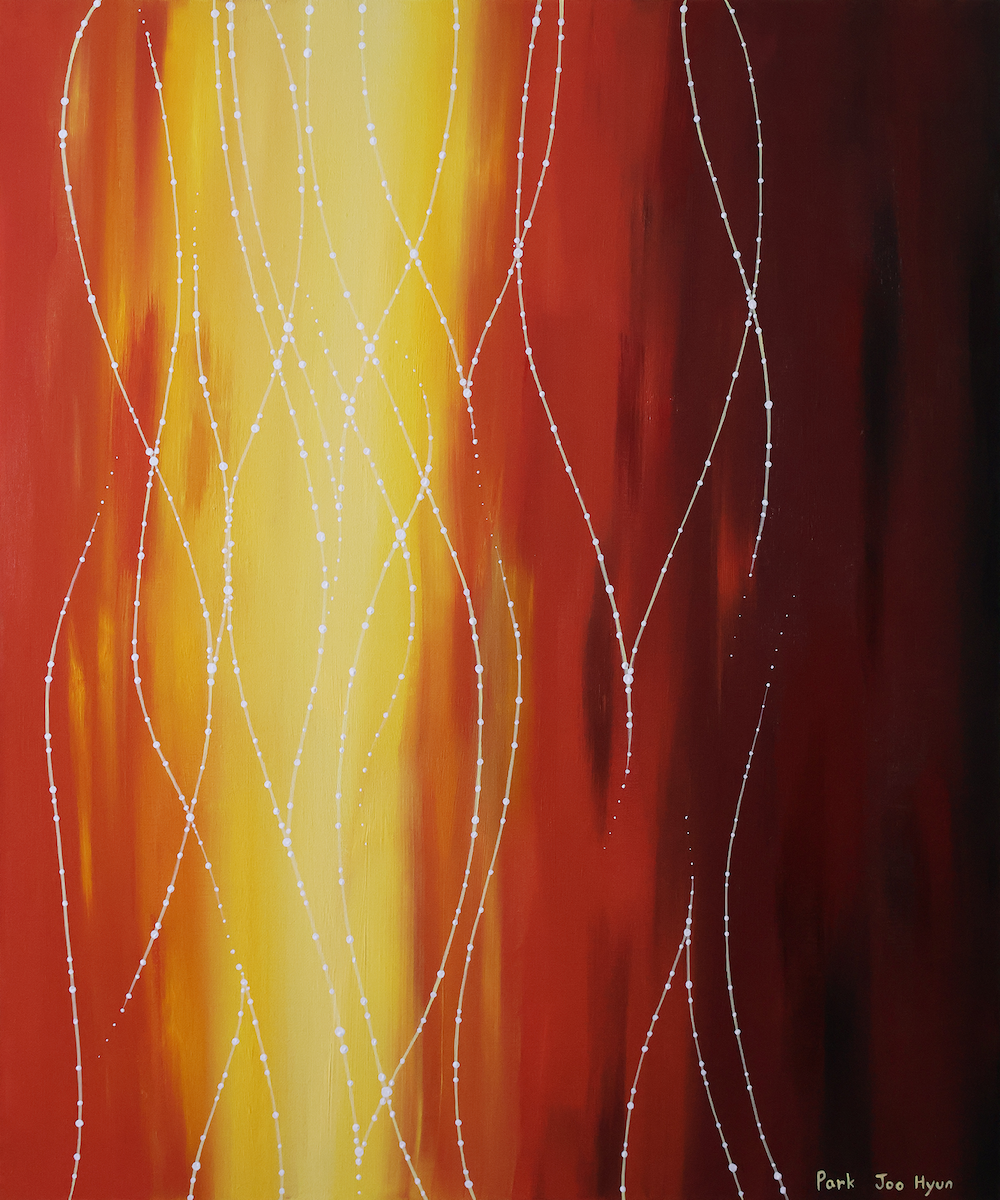 The lines, resembling autumn leaves, approach from above and below, merging as if becoming one—symbolizing the quiet fusion between self and season.