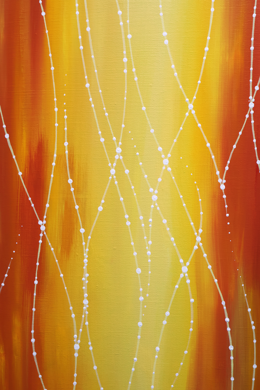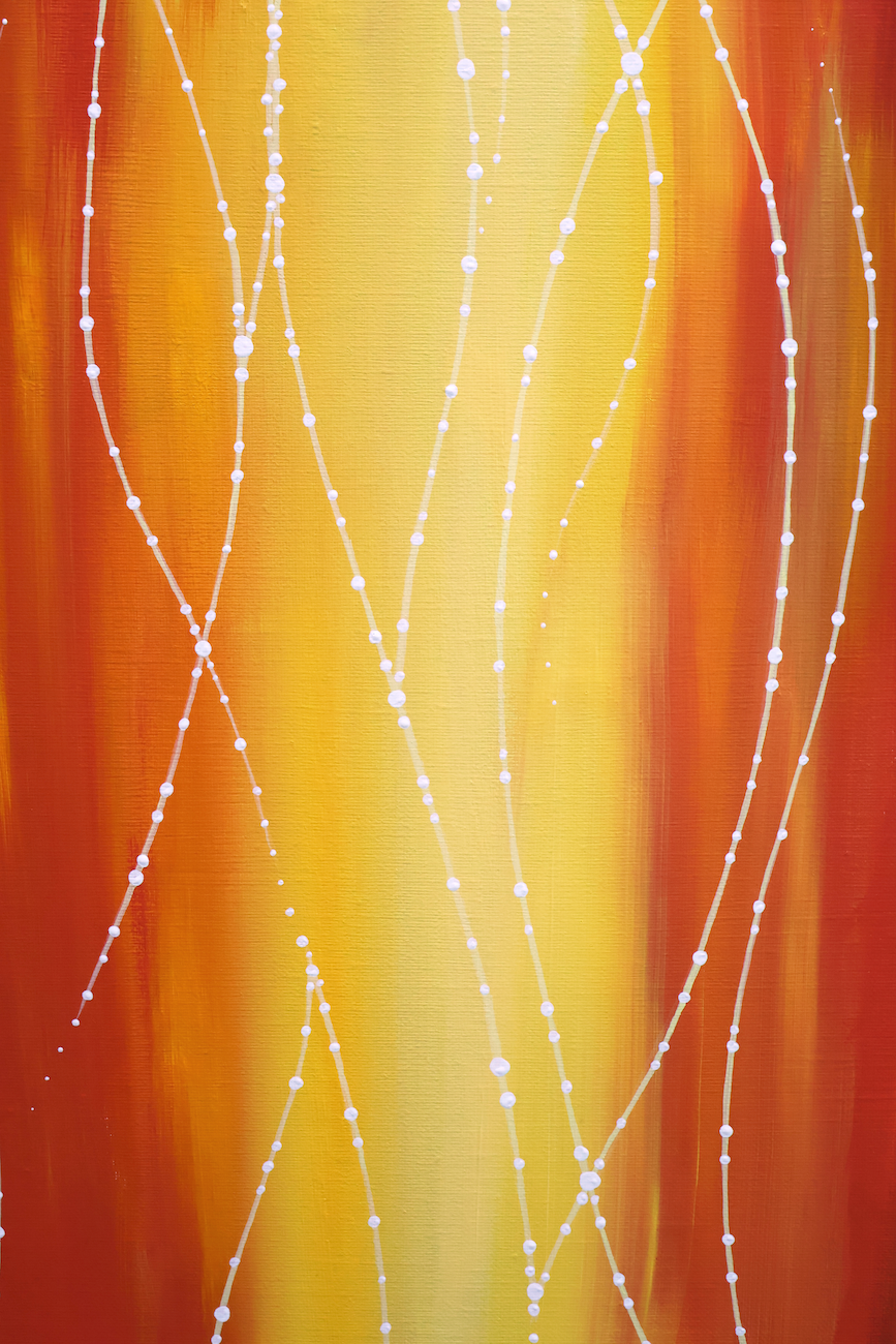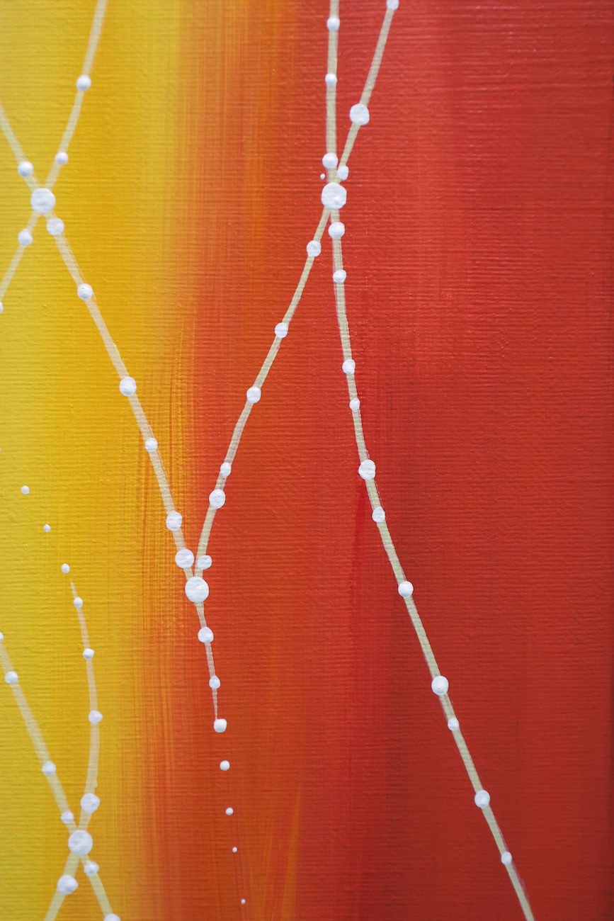 The yellow pillar in the background carries symbolic meaning that connects both works in the series. It is depicted as moving from right to left, like scenery passing by from a train window—symbolizing the flow of time.