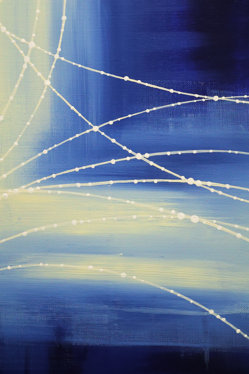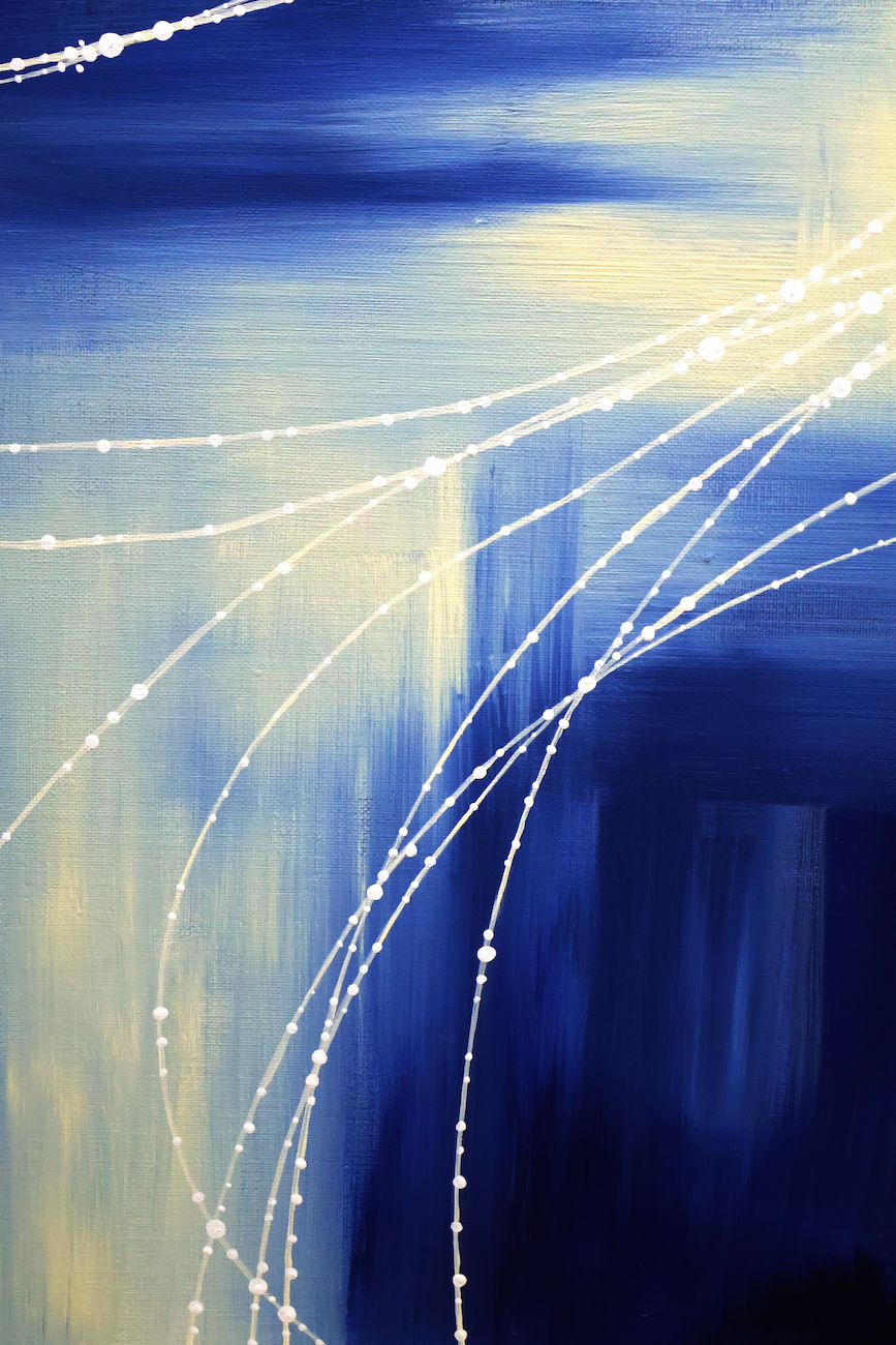 Most of the curved lines gather in parabolic shapes around the glowing slits, representing emerging ideas, while a few extend freely, expressing the ongoing, uncontainable flow of thought.