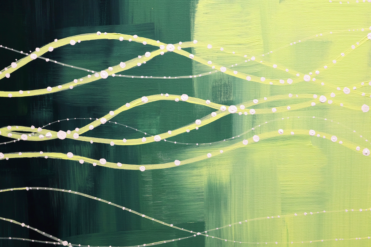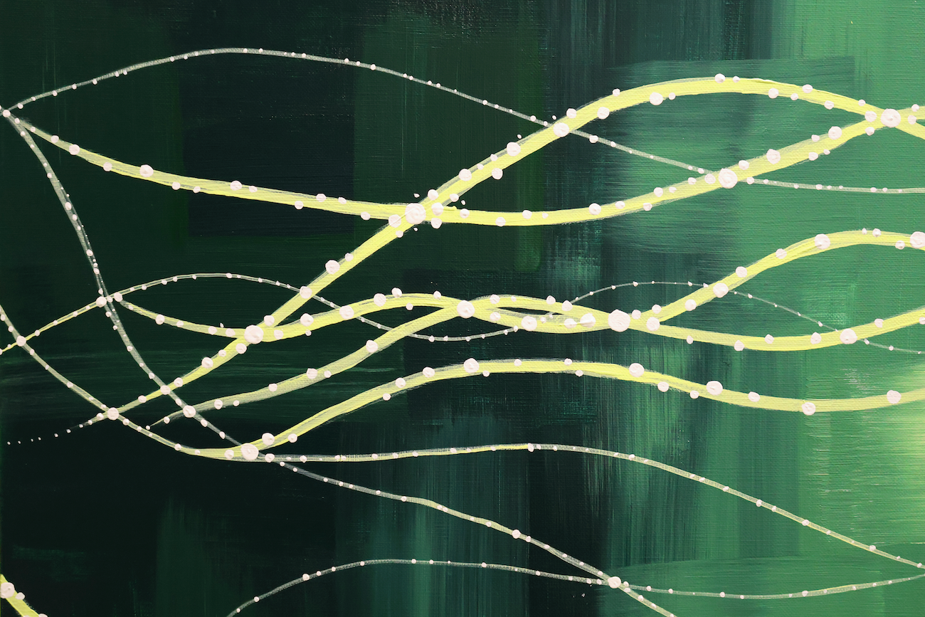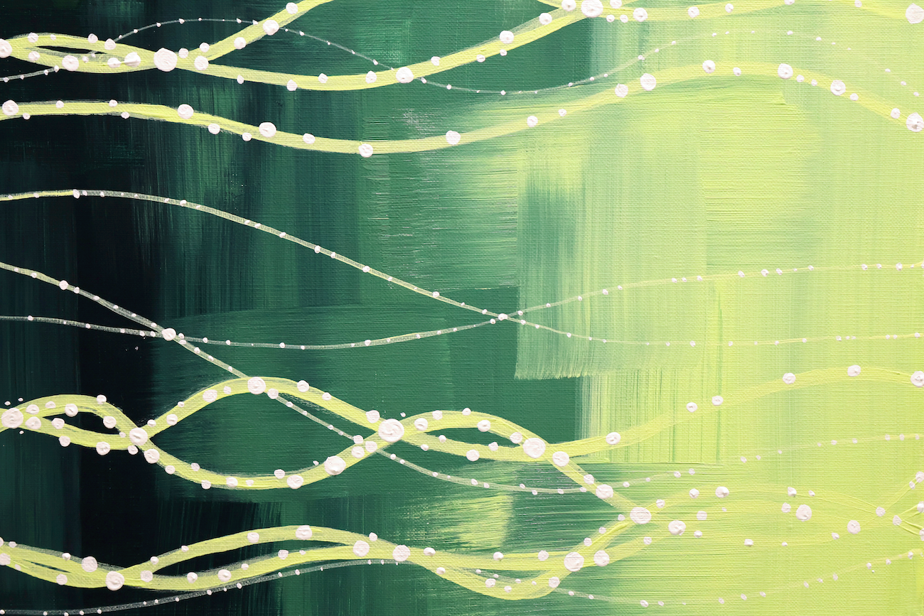To represent the Ruscus’s yearning to reach out into the world, the background begins with a radiant yellow at the center—symbolizing explosive energy—and gradually spreads outward into a mix of refreshing green, reminiscent of the plant, and encroaching darkness. All of these colors are applied with visible brush texture and a rough, organic gradient, evoking the natural breath and flow of life.