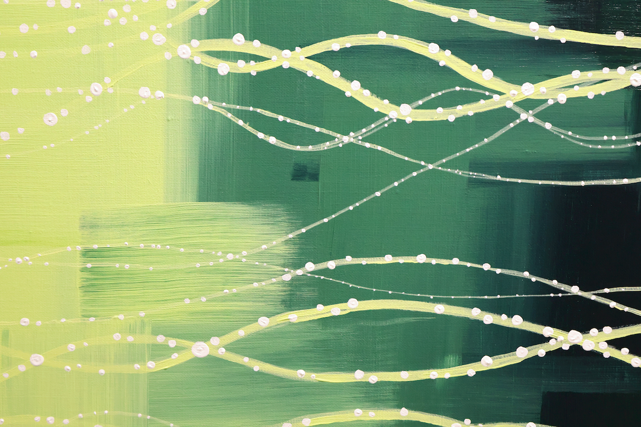 This work is composed of two canvases which, though individually framed, form a unified perspective through a continuous visual flow. This can be read as a metaphor for the ‘expanded eye’ of the Ruscus, offering viewers a unique visual experience—seeing the world through the eyes of a plant.