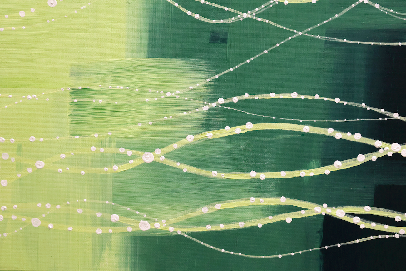 This piece personifies the plant Ruscus and visually expresses its desire to explore the world from its own perspective. The delicate yet resilient vitality of the Ruscus becomes the emotional core of the work, unfolding across the canvas as a quiet will reaching outward into the world.